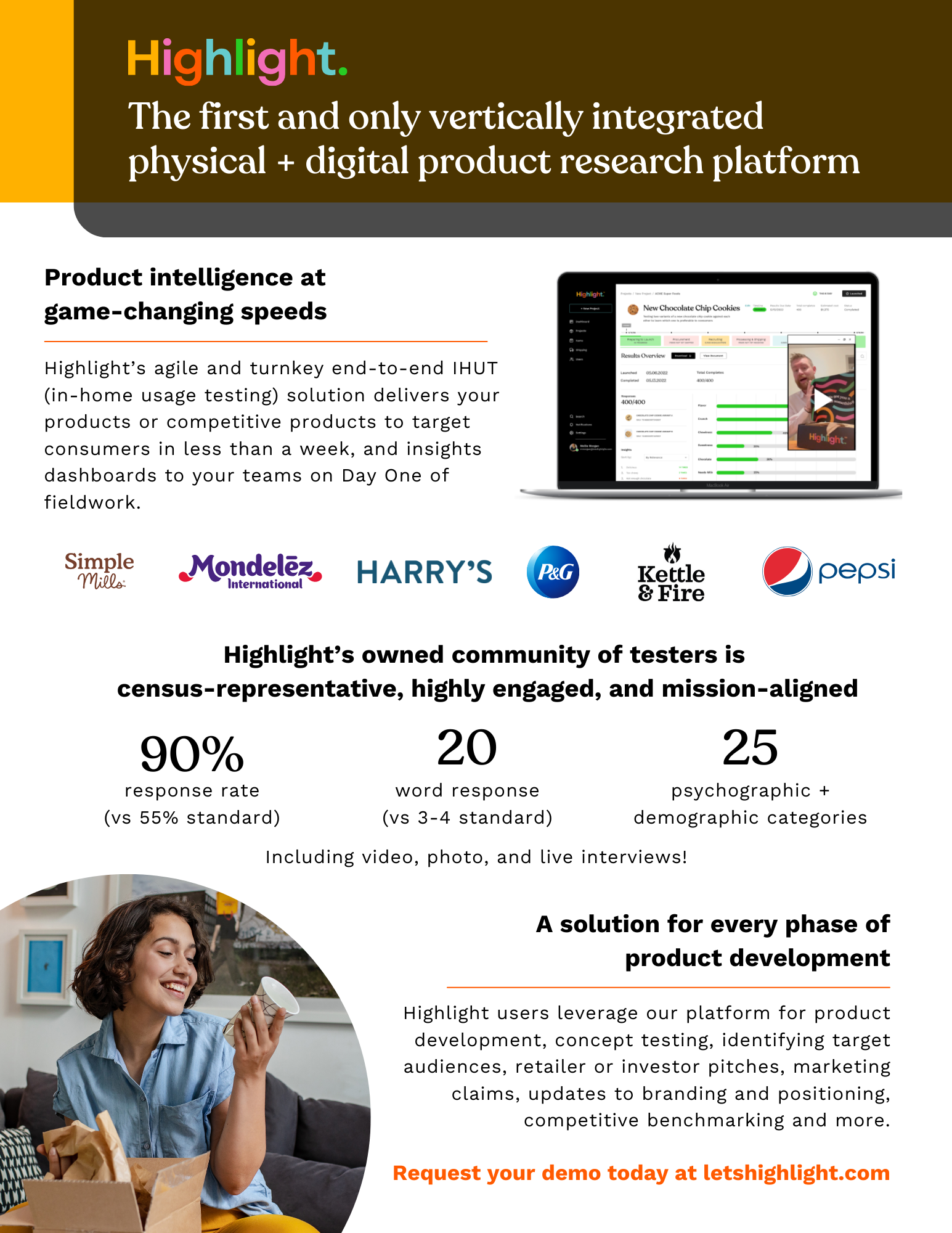 When it comes to alienation testing specifically, Highlight recommends sequential monadic testing. That’s because with a sequential monadic approach to alienation testing, you’re able to get both the control and the test in the hands of your testers, quickly and efficiently to determine preference between two products. And we know that speedy access to the data you need for innovation, retailer conversations, investor pitches and beyond is crucial.